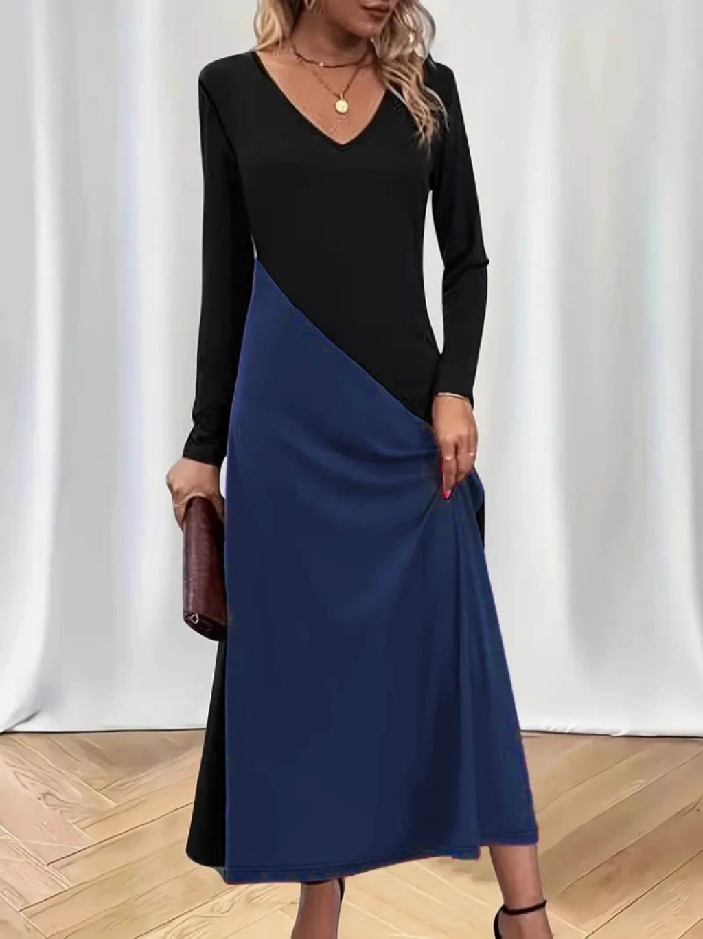 Kadın Uzun Kollu V Yakalı Blok Desenli Viskon Elbise