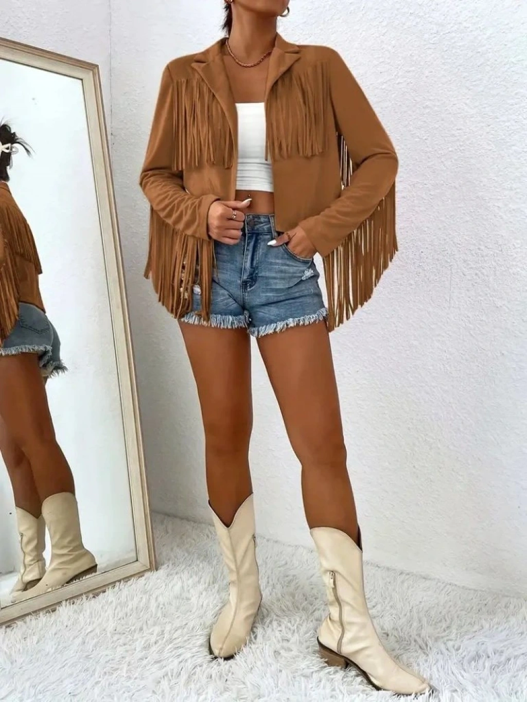 Kadın Uzun Kollu Yakalı Kısa Püsküllü Süet Ceket