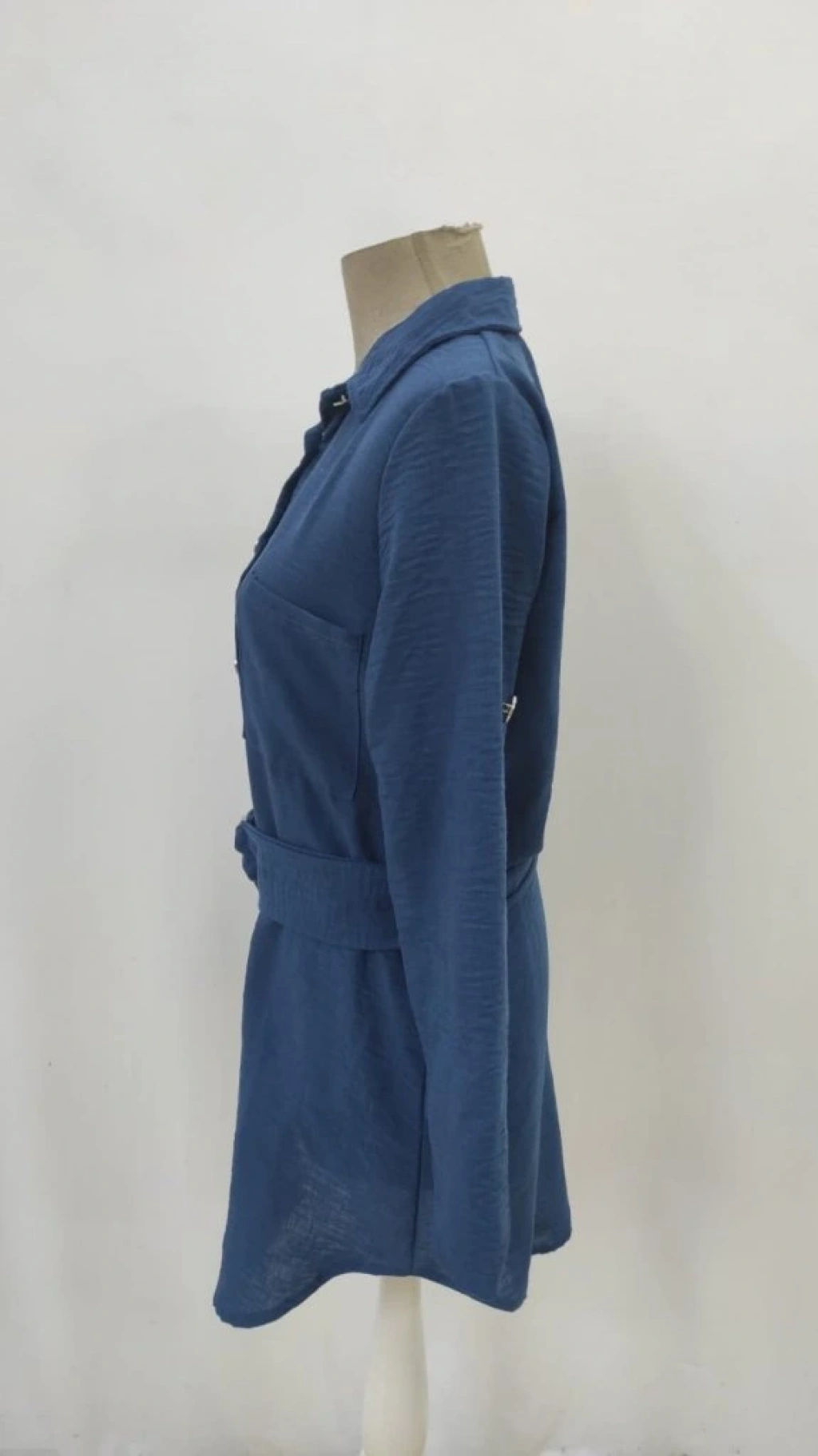 Kadın Uzun Kollu Yakalı önden Düğmeli Beli Kuşaklı Mini Ithal Keten Elbise