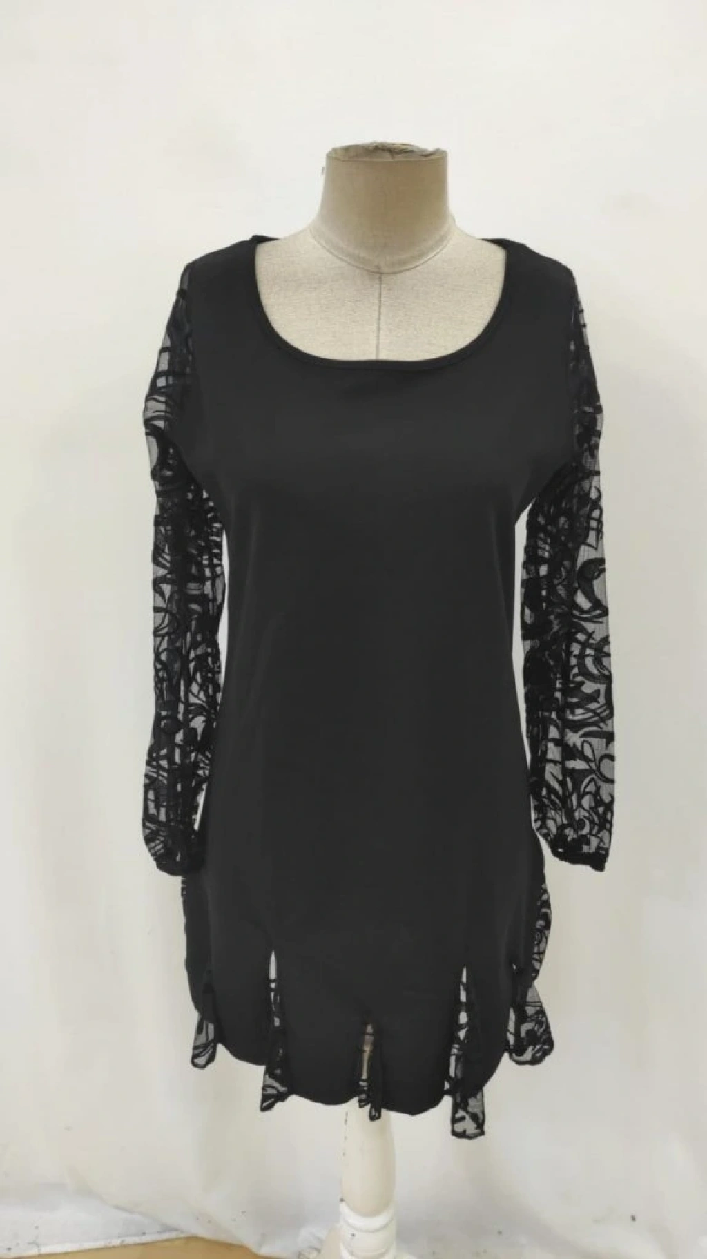 Kadın Uzun Kollu Yuvarlak Yaka Kol Ve Etek Ucu Dantelli Kısa Ithal Krep Elbise