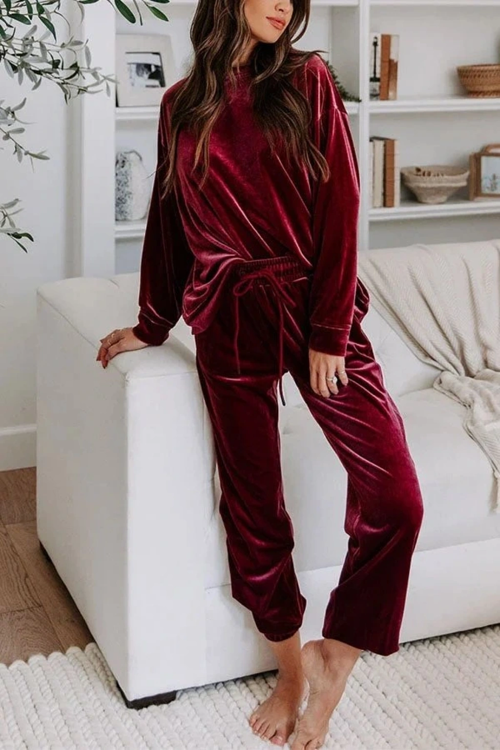 Kadın Uzun Kollu Yuvarlak Yakalı Kadife Bluz Ve Pantolon Takım