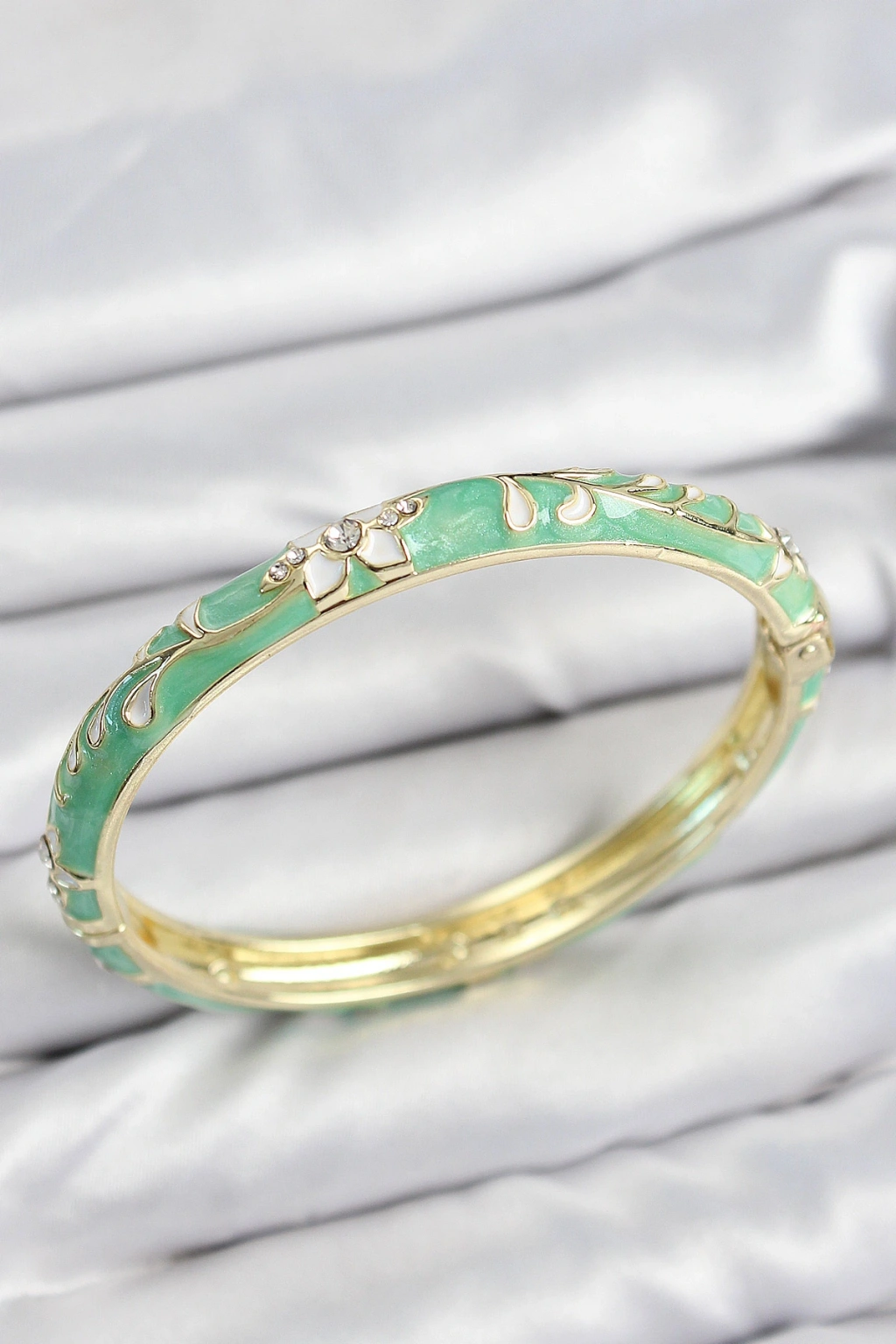 Mineli Pirinç Zirkon Taşlı Yeşil Çiçek Motifli Gold Kadın Kelepçe