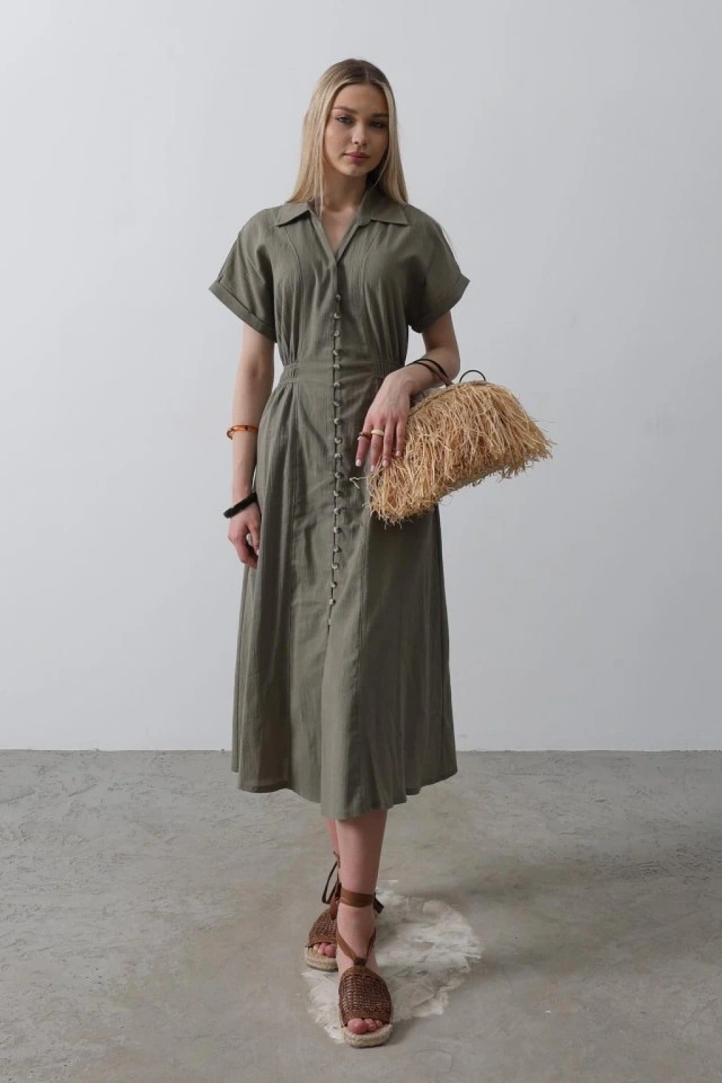 Önü Düğmeli Kısa Kol Elbise - Haki