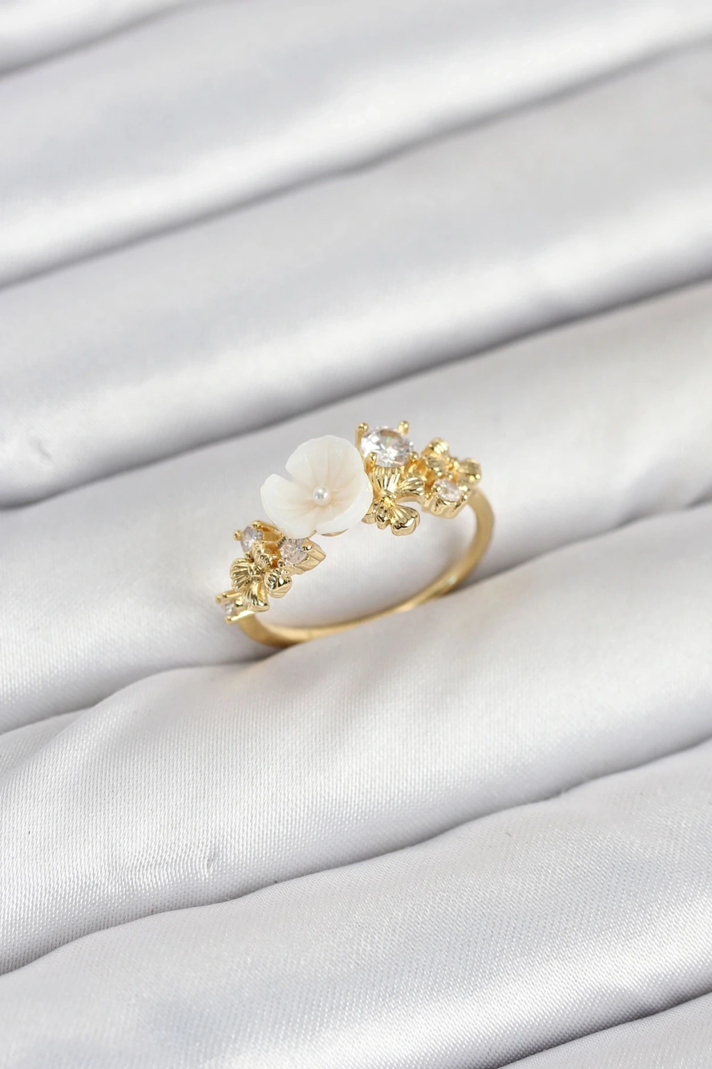 Pirinç Gold Renk Çiçek Model Zirkon Taşlı Kadın Yüzük