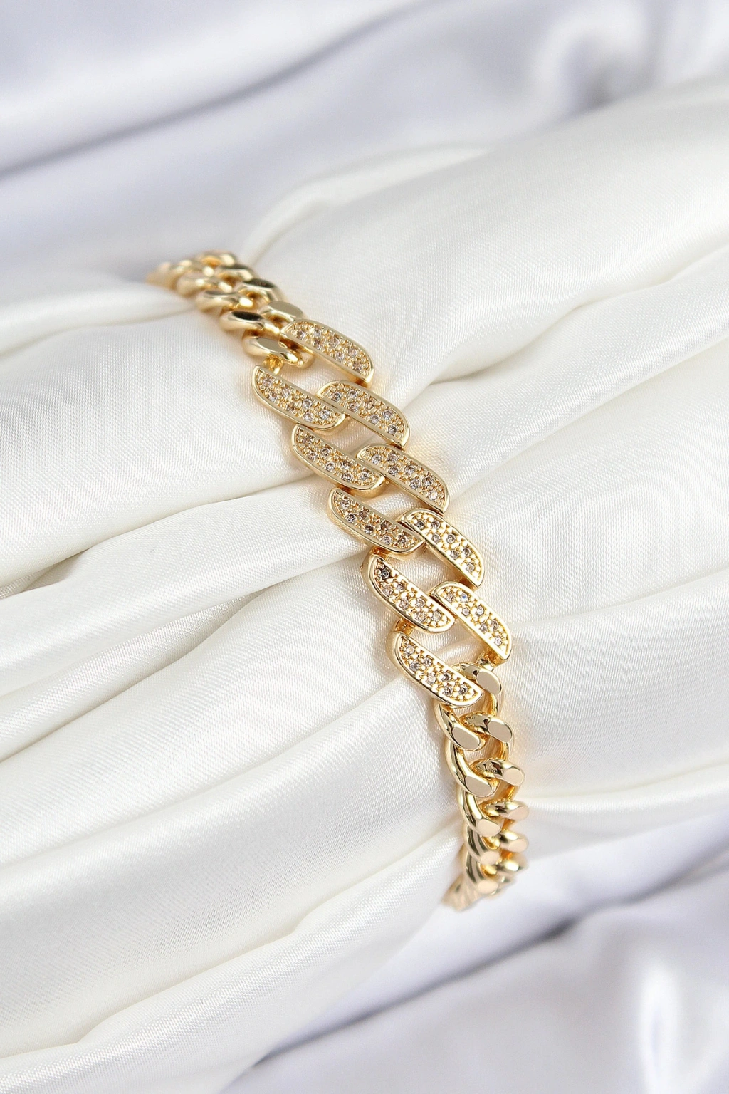 Pirinç Zirkon Taşlı Ezme Küba Zincir Model Gold Renk Kadın Bileklik