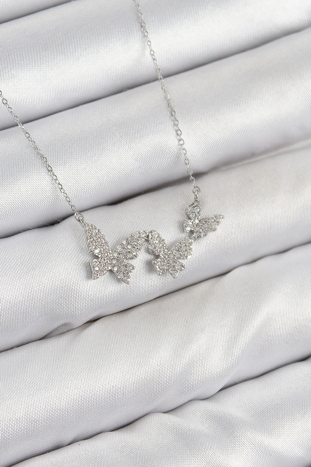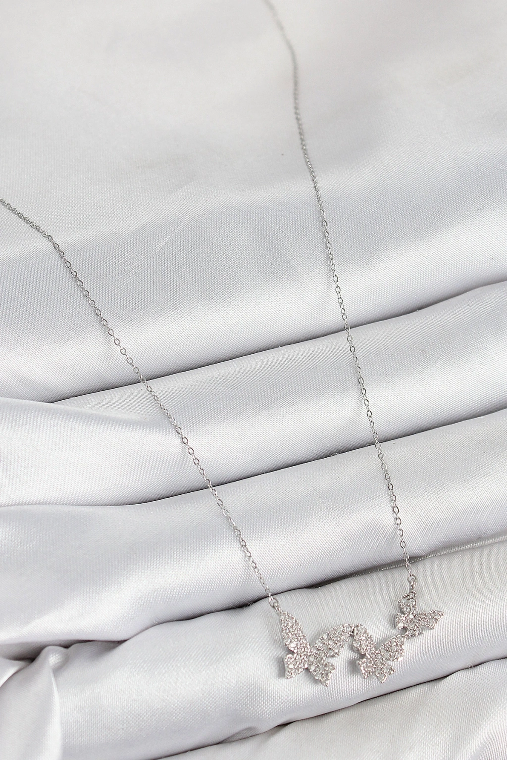 Pirinç Zirkon Taşlı Kelebek Model Gümüş Renk Kadın Kolye