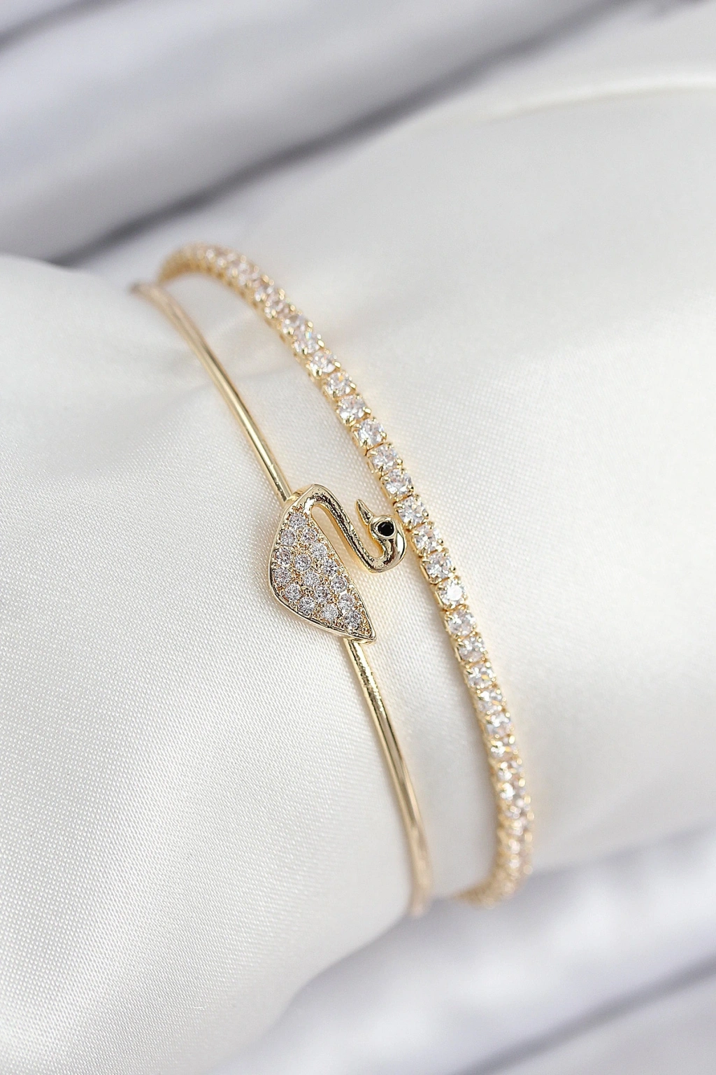 Pirinç Zirkon Taşlı Kuğu Model Gold Renk Kadın Bileklik