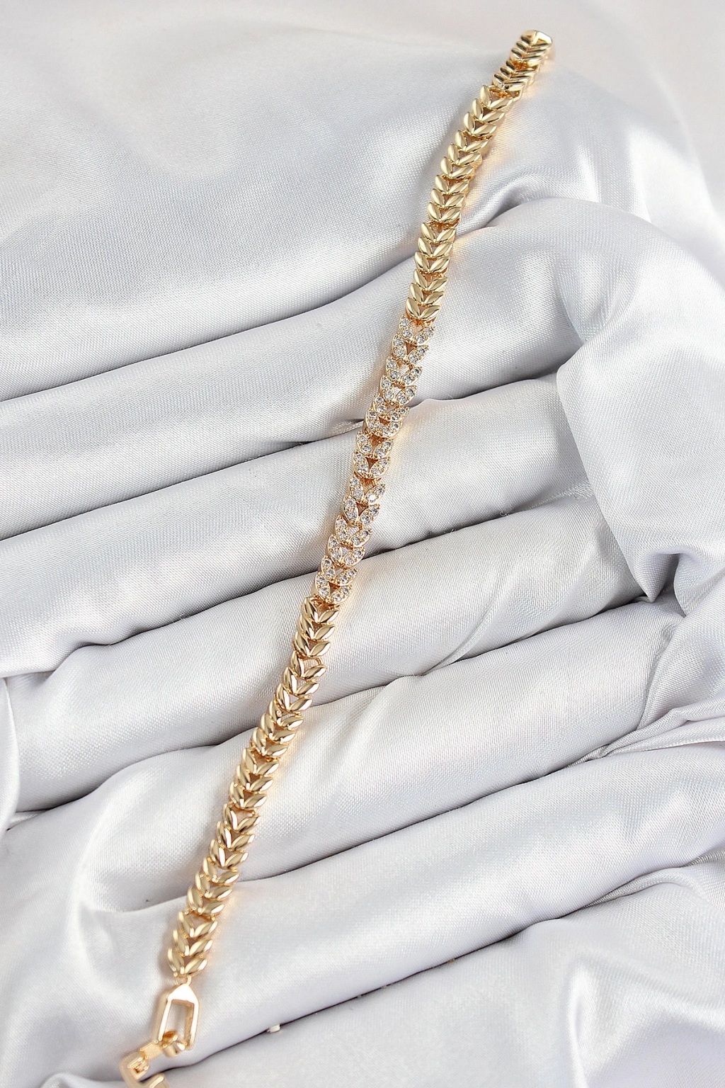 Pirinç Zirkon Taşlı Sıralı Yaprak Model Gold Renk Kadın Bileklik