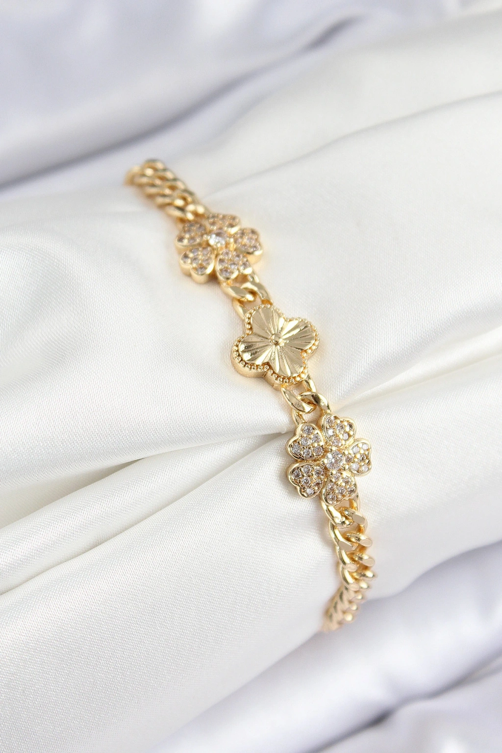 Pirinç Zirkon Taşlı Yonca Model Gold Renk Kadın Bileklik