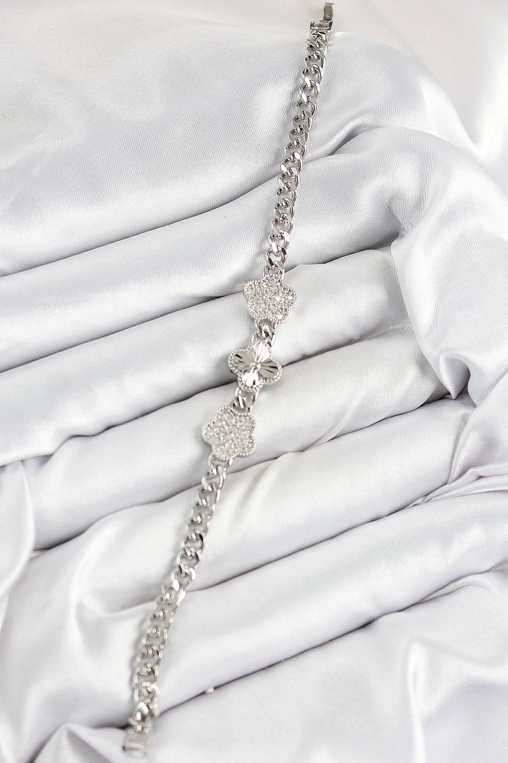 Pirinç Zirkon Taşlı Yonca Model Gümüş Renk Kadın Bileklik