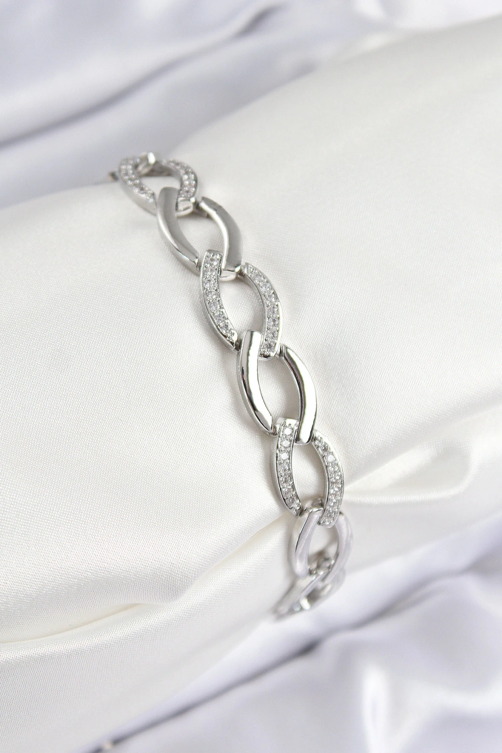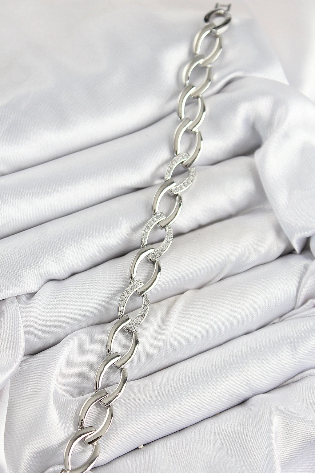 Pirinç Zirkon Taşlı Zincir Model Gümüş Renk Kadın Bileklik