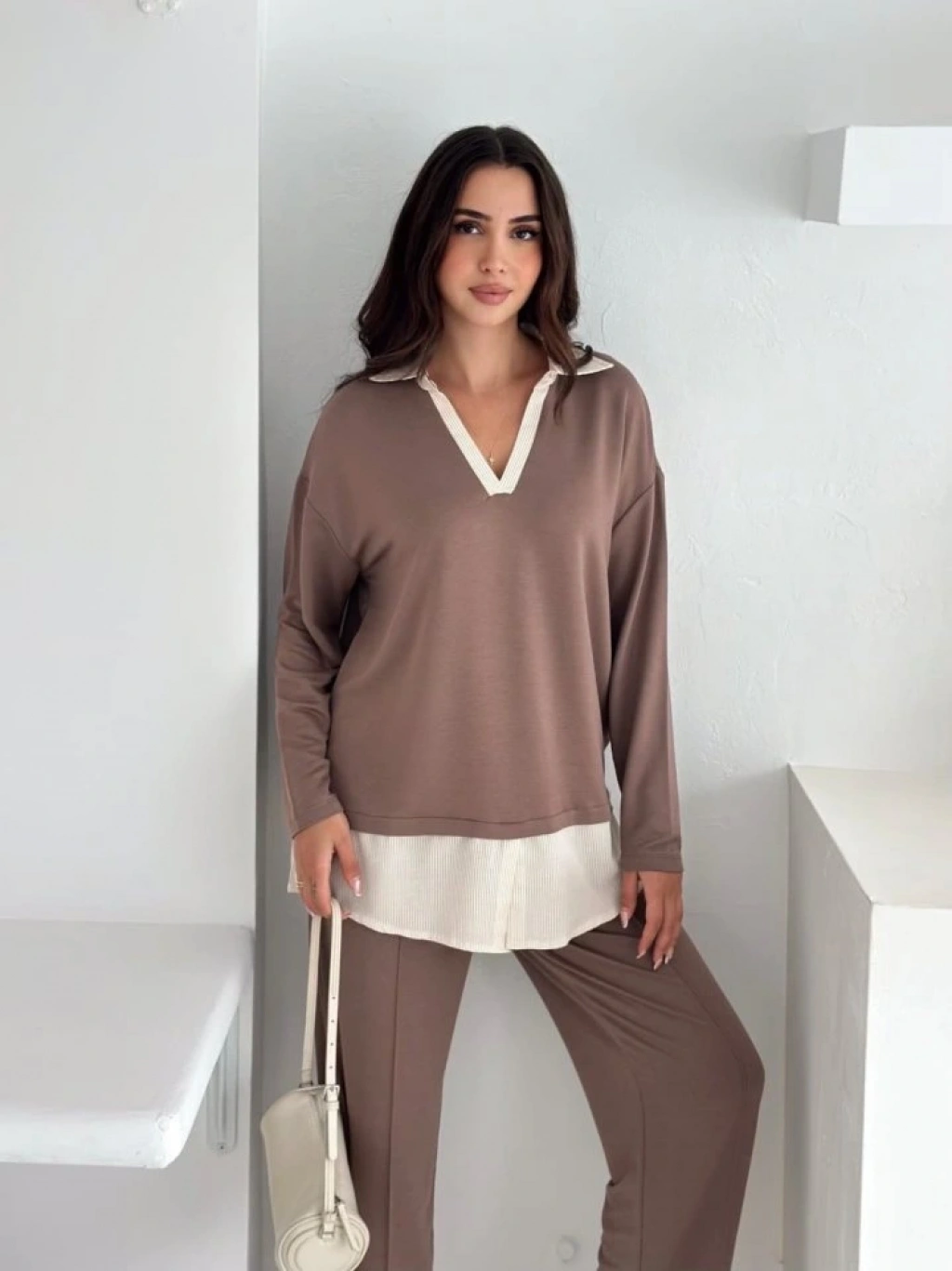 Polo Yaka Gömlek Detay Salaş Balon Pantolunlu ıkılı Takım