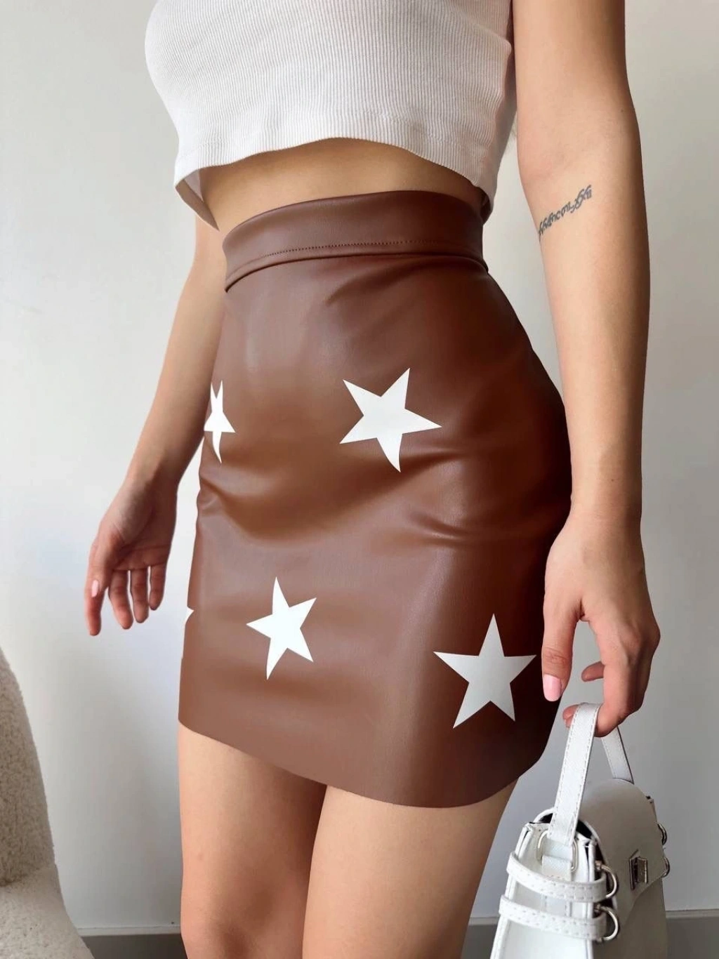 Yıldız baskılı deri etek kahve
