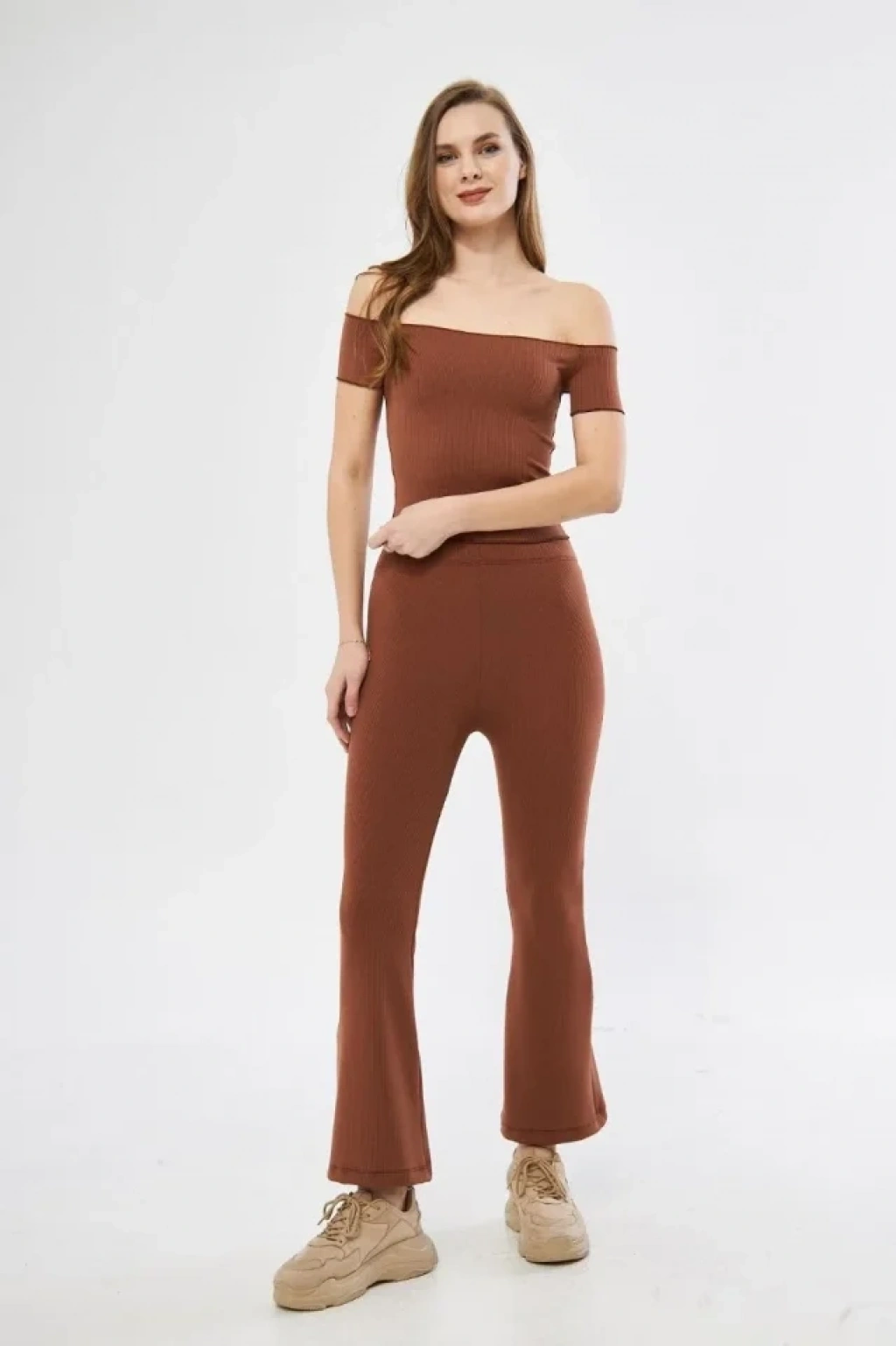 Yüksel Bel Fitilli İspanyol Paça Tayt - Kahve